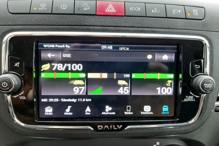 A torlódás asszisztens viszont nagyon jól tette a dolgát. Ennek lényege, hogy dugóba érve egy gombbal az előttünk álló járműhöz állíthatjuk a Daily-t, azaz a csigatempóban haladó forgalomban a furgon akkor fog elindulni és megállni, amikor az előtte álló is így tesz, közben pedig természetesen követési távolságot is tart.