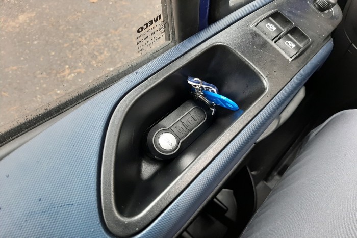 A Daily immáron elektromos rögzítőfékkel rendelkezik, amelynek kapcsolója az automata váltótól balra kapott helyet, a műszeregységhez közel. Az Iveco sajtóanyaga nagyon aranyosan kiemeli, hogy a kézikar eltűnésével több hely marad, de én inkább azt mondanám, elsődleges előnye, hogy eggyel kevesebb kiálló kallantyúba fog beakadni a táskád, vagy a ruhád. Legeslegfontosabb előnye persze az, hogy parkoláskor automatikusan aktiválódik, a gázpedálra lépve pedig önműködően old, azaz biztosan nem fogod elfelejteni behúzni.