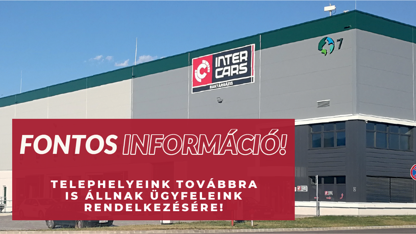 A koronavírus terjedése miatt, az Ön és munkatársai egészségének megóvása érdekében elővigyázatossági okokból javasoljuk, hogy rendeléseit elsősorban az Inter Cars online katalógusán (www.icwebshop.hu) vagy kirendeltségeink telefonos ügyfélszolgálatán (www.intercars.hu/kapcsolat/) keresztül szíveskedjen leadni. Javasoljuk továbbá, hogy a járványidőszakban lehetőség szerint személyesen ne keresse fel kirendeltségeinket.