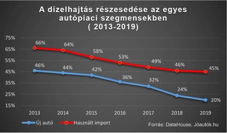 Immár hetedik éve tart a dízelautók visszaszorulásának trendje a hazai autópiacokon. Ez idő alatt a dízelautók aránya a forgalomba helyezett új személyautók körében 46-ról 20 százalékra zuhant, miközben az importált járművek közötti részarányuk 66-ról 46 százalékra csökkent. A dízelmotorral szemben tapasztalható bizalomvesztés több okra vezethető vissza. Egyrészt az elmúlt évek során a tulajdonosok széles köre szerezhetett negatív tapasztalatot arról, hogy főként az idősebb, gyakran bizonytalan külföldi előélettel rendelkező dízelautóknak jóval magasabb lehet a javítási költsége. Másrészt egyre több nyugati nagyvárosban vezetnek be komoly korlátozásokat a dízelüzemű személyautókkal szemben, ami növeli a bizonytalanságot a járművek jövőbeli használhatóságát illetően. Emellett az utóbbi években a gázolaj ára gyakran 30-40 forinttal is a benzinár felett mozgott, ami csökkentette a dízelautóknak a kedvezőbb üzemanyag-fogyasztásból származó költségelőnyét is.