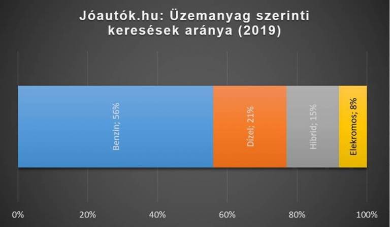 A JóAutók.hu keresési statisztikái szerint a potenciális vevőknek is mindössze 21 százaléka keresett dízelmotoros személyautókat, miközben a keresések 56 százaléka benzines, 23 százaléka pedig hibrid vagy teljesen elektromos autókra irányult 2019-ben.