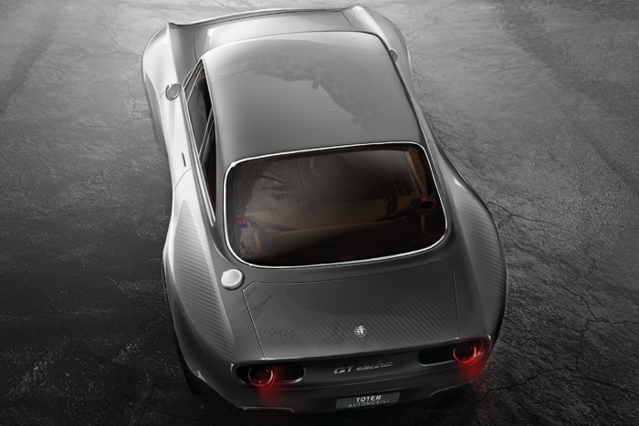 Csak 10%-át tartják meg az Alfa Romeo GT Junior eredeti vázának, amiből aztán a Totem GTelectric születik. Az autóhoz új, teljesen alumínium platformot és szénszál erősítésű műanyag karosszériaelemeket készítenek. Az egész sokkal merevebb lesz, amit a nagy teljesítmény is indokol majd, plusz így tudják a lehető legalacsonyabban tartani a súlyát. Elvégre nehézségnek ott lesz benne az akksicsomag.