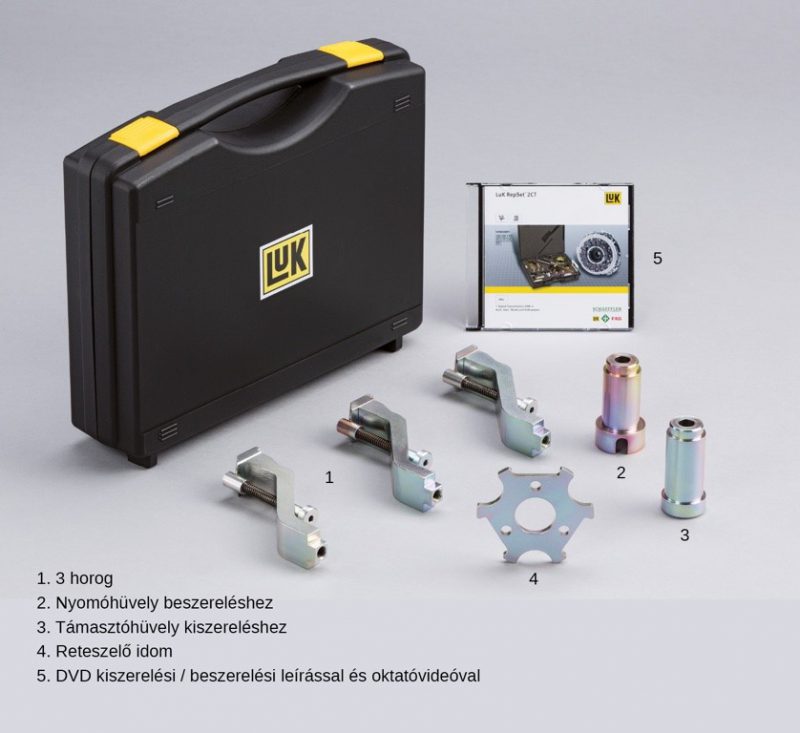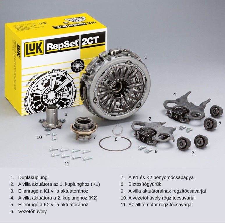 A LuK RepSet 2CT (Twin Clutch Technology) minden olyan alkatrészt tartalmaz, amely a duplakuplungos rendszer cseréjéhez szükséges. Nemcsak a duplakuplungot, hanem a benyomórendszert is ajánlatos kicserélni. A Schaeffler Automotive Aftermarket a LuK RepSet 2CT készlettel egy gyakorlatorientált komplett megoldást kínál. Az ebben megtalálható alkatrészeket gyárilag pontosan egymáshoz igazították. Emiatt az olyan hibás működések, mint a pl. amik a vegyes beszerelésből adódnak, már eleve kizártak.