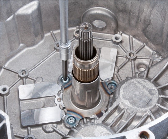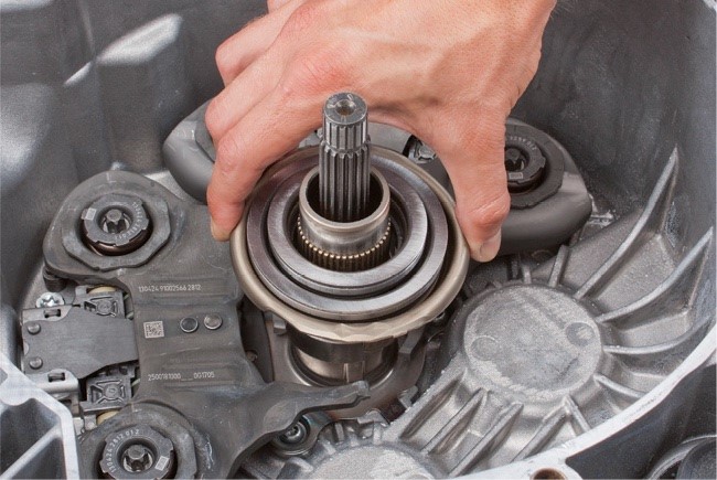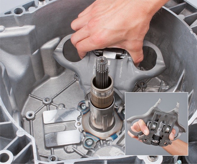 • Helyezzék az új kuplungcsomagot az üreges tengelyre; az enyhe elforgatás arra szolgál, hogy a K2 kuplungtárcsa fogazása beilleszkedjen az üreges tengely fogazásába.