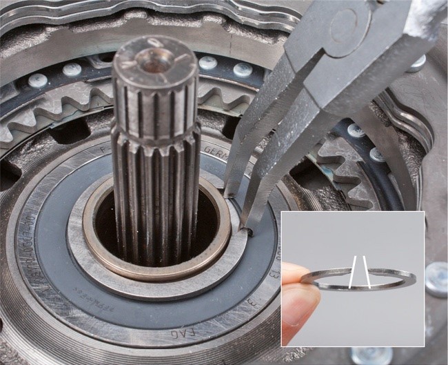 • Szereljék fel az új biztosítógyűrűt a zégerfogóval (KL- 0192-12) az üreges tengelyre. A biztosítógyűrűnek az az oldala, amelyen a nyílás kisebb, felfelé mutat.