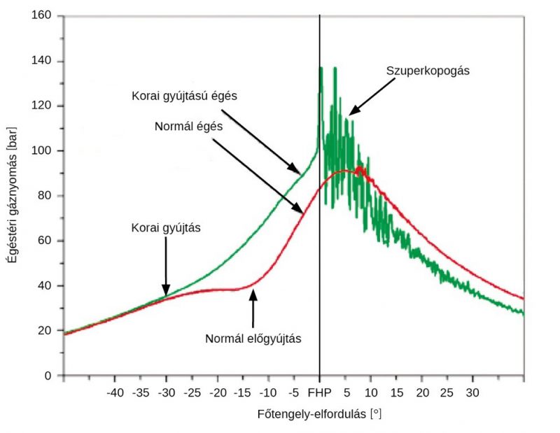 Ha megtörténik a korai gyújtás, nagy a korai hőfelszabadulás, ennek megfelelően rendellenesen nagy nyomás alakul ki és eközben a dugattyú még halad az FHP felé. A nagy hengertéri nyomás és nyomáshullám a még el nem égett keverékben öngyulladást vált ki. Ez a kopogás, intenzív nyomáslengés, melynek joggal adták a szuperkopogás nevet, dugattyúsérülést okoz.