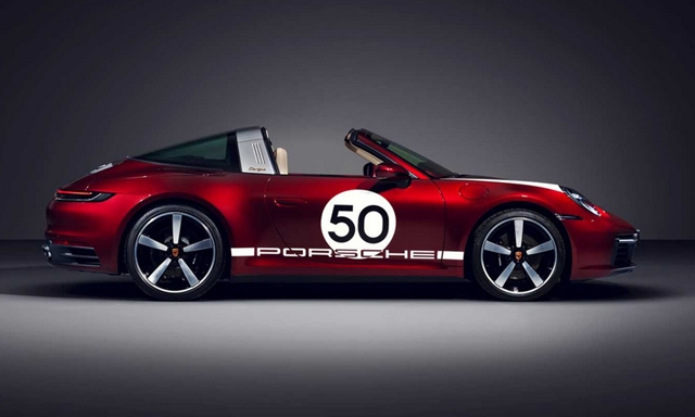 A Porsche 911 Targa 4S Heritage Design Edition az 50-es évekbe és a 60-as évek elejére repít vissza bennünket. A Cherry Metallic és további négyféle fényezéssel rendelhető újdonság logói arany színben pompáznak, de látványosak a fehér díszcsíkok, az oldalsó 50-es számjelzés és a méretes Porsche felirat, valamint az egyedi ötágú felni is.