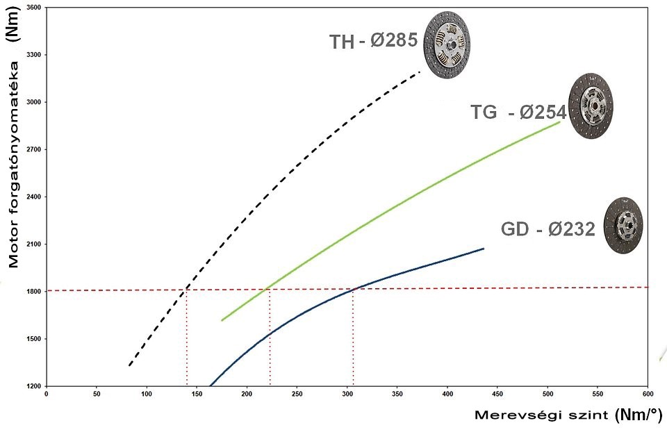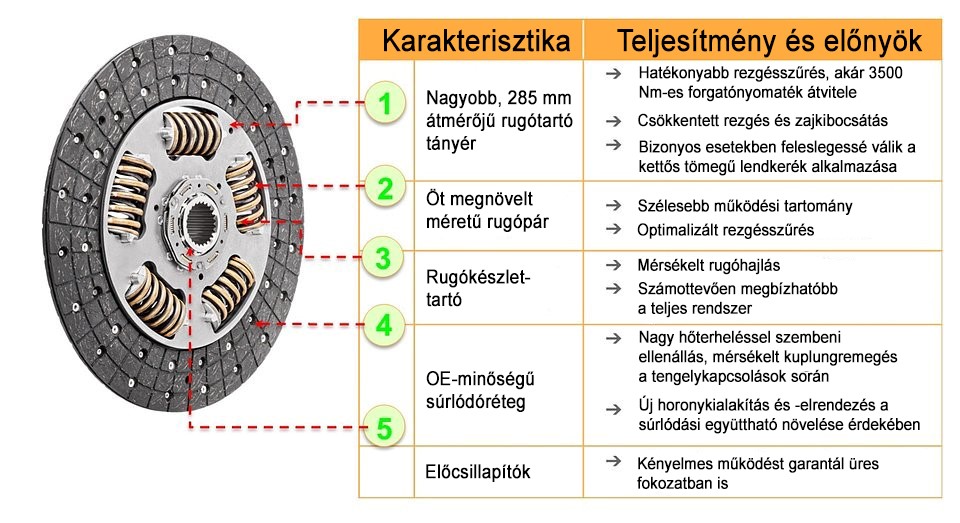 Hogy lehetséges mindez? Míg a TG tárcsákban a rugótartó tányér átmérője 254 mm, a TH-nál 285 milliméter mérhető. Milyen előny származik a nagyobb átmérőből? Hatékonyabb a rezgésszűrés és – bizonyos esetekben – nagyobb forgatónyomaték vihető át (akár 3500 Nm is), nem mellesleg csendesebb a hajtáslánc működése. A rendszer olyannyira hatékony, hogy bizonyos modelleknél a kettős tömegű lendkerék beépítését is feleslegessé teszi.