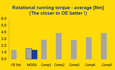 A forgatónyomaték azt jelenti, hogy mennyire simán tudjuk mozgatni a gömbcsapot. Minél alacsonyabb a forgatónyomaték, annál simább a kormányberendezés. A kevesebb súrlódás az anyag kevesebb erózióját és hosszabb élettartamot jelent. A játék jelentősen csökken. A MOOG hibrid magforgatónyomaték-értékei sokkal közelebb állnak az OE-értékekhez, így jobb kormányzási pontosságot, hosszabb tartósságot és gyorsabb reakcióidőt biztosítanak. Tehát a MOOG hibrid mag alkatrészei megfelelnek az OE teljesítmény, szilárdság és tartósság szabványoknak.