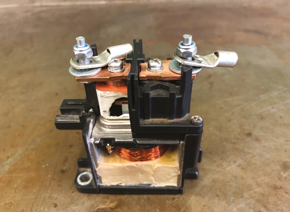 Ennek a neve nem kapcsolórelé, habár lényegében az, hanem a nagy áramok miatt az elektrotechnikában kontaktor a megnevezése. DC áramok áramkörét szakítja meg 80 A-től akár 1500 A-ig. A kontaktor fő része az érintkezőpár, amelyen az áram folyik át. Ezek lehetnek fő- és segédérintkezők (egyéb kiegészítő működtetés, vagy visszajelzés céljából), amiket rugók feszítenek elő. Az elektromágnes (tekercs) a húzóerőt biztosítja az érintkezők zárásához. Eddig sok újat nem mondtunk. A megszakítás során keletkező elektromos ív kioltása itt a feladat, mert az íváram az érintkezőket erodálja ➊. (A mechanikus megszakítású „ősi” gyújtásoknál ezt a kondenzátor oldotta meg.) Sokféle megoldást alkalmaz az erősáramú elektrotechnika mind a DC, mind az AC áramok ívhúzásának kioltására, például levegővel fújják el az ívet, vagy felforrósított kerámialapokkal térítik el. DC áramkörben a mágneses ívoltók állandó vagy elektromágnest használnak az ív kioltására, oldalirányú megnyújtására és elmozdítására. Két elvi ábra is segít ennek megértésében ➋ ➌. A mágneses ívoltású kontaktorokat Albright kontaktoroknak is nevezik. Angolul: high-capacity DC cutoff contactor (vagy relay) with magnetic arc supression.