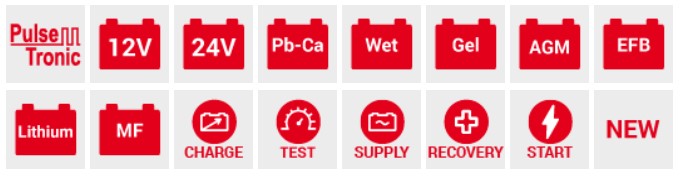Többfunkciós, elektronikus akkumulátortöltő, indító és tesztelő (BATTERY MANAGER), WET, GEL, AGM, MF, PbCa, EFB és Li akkumulátorokhoz 12 / 24V feszültség mellett.