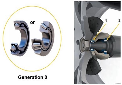 A 0. generáció csapágyai egysoros csapágyak, melyek vagy görgőkkel, vagy pedig kúpos hengerekkel vannak ellátva, amelyek nincsenek hüvelybe zárva. Előnye, hogy ezek az alkatrészek az alacsony árkategóriájú termékek közé tartoznak, viszont cserébe nehézkes a beszerelése és időközönként karbantartást igényel.