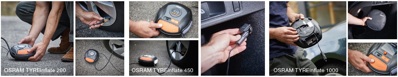 A gépkocsiba beépített 12 V-os csatlakozóval, tekercselő mechanikával ellátott integrált tápkábellel ellátva, egy rugalmas légtömlő, könnyen hozzáférhető tárolóval, így könnyű elérni a gumiabroncsokat a járművén. Gyors felfújási idővel a nagy nyomásmérő három különböző nyomásegységgel – bar, kPA és PSI – megkönnyíti a gumiabroncsok nyomásának leolvasását. Tartozék tárolórekesz a gumiabroncs-szelep kupakjaihoz, a nagy be- és kikapcsoló gomb az egyszerű aktiválás és a lapos kialakítás tökéletes a gyors munkához. Könnyen használható anélkül, hogy további eszközökre lenne szükség. Az OSRAM légkompresszor nem csak az autó gumiabroncsaihoz használható, a mellékelt háromrészes adapterkészlettel felfújhatja a motorkerékpár, kerékpár, pótkocsi és még babakocsik kerekeit is, amennyiben fel vannak szerelve pneumatikus gumiabroncsokkal. Ezen kívül használható sportfelszereléshez felfújható csónakokhoz labdák, matracok, vízi játékok felfújására is.