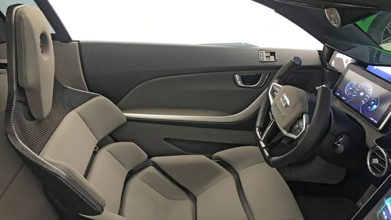 A koncepcióhoz képest döbbenetesen szépen kidolgozott, futurisztikus utastér a szél- és vízálló bevonatok, valamint a hagyományos karbon-bőr borítások kombinációját hozza. A műszerek mindegyike teljesen digitális, a sofőr összesen hat különböző kijelzőn tarthatja a kapcsolatot a járművel.