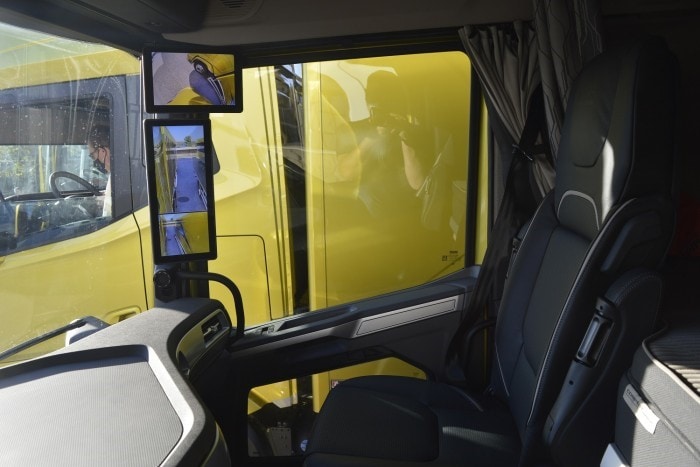 Vezetés közben jól jön a digitális kamera, amely akkor is éles és színes képet mutat, amikor például a Nap a kamion mögött van. További előnye, hogy követi a pótkocsi hátulját kanyarodáskor, illetve előzéskor vagy sávváltáskor kis rovátkák jelzik, hogy hol van a szerelvény vége, így biztosan nem akasztja be az ember a félpót végét a mögötte haladóba. Az is praktikus megoldás ebben a digitális visszapillantóban, hogy gombnyomásra behajtható, amit emlékeim szerint eddig egyetlen egy haszonjármű gyártó sem csinált meg. (A sajtóteszten rákérdezem az örök ellenségre, vagyis a vakító hótakaróra, de azt mondták, hogy a kamerák, még akkor is tiszta képet mutatnak.)