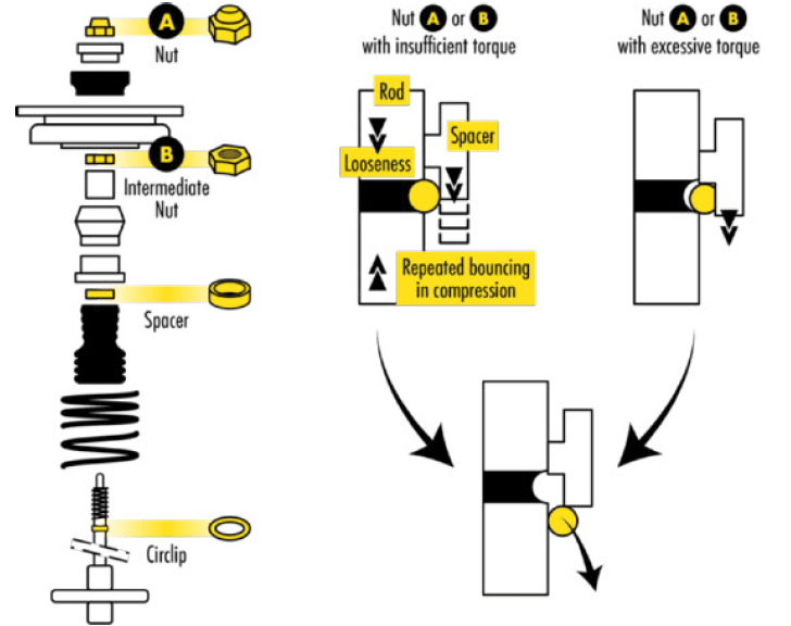 Ezt az anyát 1,5–3 daNm közötti nyomatékkal kell meghúzni. (Az anya kézzel való meghúzása körülbelül 2 daNm nyomatékot jelent.) Az elégtelen nyomaték nemkívánt rezgéseket és zajt okozhat, míg a túl magas nyomatékérték kimozdíthatja a biztosítógyűrűt megfelelő helyzetéből, károsítva ezáltal a lengéscsillapítót és más alkatrészeket.