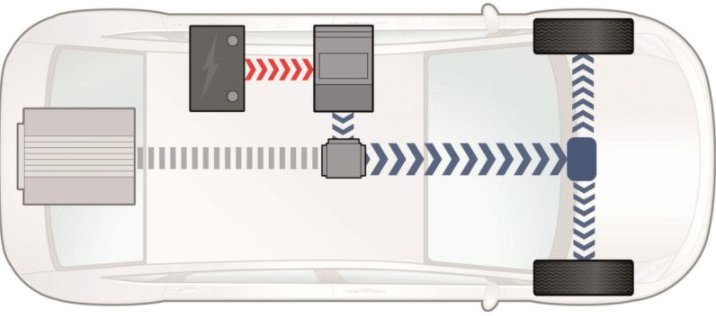 Ha kisebb meghajtó teljesítményre van szükség, pl. városi vezetésnél csak az elektromos motort használják erőegységként. A belső égésű motor le van kapcsolva. Az ilyen hajtás egyik előnye: nincs üzemanyag-fogyasztás és nincs károsanyag-kibocsátás.