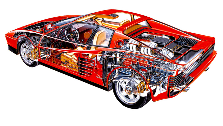 Minden dimenziójában nagyobbra nőtt a BB-nél a Testarossa és közel 6,5 centivel megnyújtott tengelytáv miatt a beltér is sokkal tágasabb lett, így a két ülés mögött bőséges hely jutott a csomagoknak. Mert lehet, hogy aki Ferrarival jár, az minden megvesz helyben, de a temérdek cuccal tömött, méretre szabott ferraris bőröndöt is haza kell juttatni valahogyan. A Ferrari Testarossa varázsát nem a tökéletesítés adja, hanem a formaterv, ami még mindig hatalmasat üt. Mindenkinek azonnal megvan, hogy ez a nagyon lapos, lovacskás autó, a rácsokkal az oldalán. A szerencsésebbek élőben csodálhatták meg, mások Bburago kisautóként tologatták a szőnyegen, egyesek pedig a Miami Vice miatt ismerik, de az egészen biztos, hogy a vonalait nem felejtik soha.