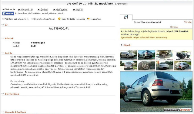 Részemről kép nélküli hirdetésekkel nem szoktam foglalkozni, ha már el akarnak adni valamit, legalább arra vegyék a fáradságot, hogy lőjenek két-három fotót, amiből legalább annyi kiderül, hogy rommá van-e törve, esetleg rojtosra rohadva az adott példány. Viszont attól, hogy szépek a képek, még nem biztos, hogy az autó is jó, és fordítva: béna, rossz szögekből elkészített, enyhén homályos fotókkal is hirdetnek nagyszerű vételeket. Sokkal árulkodóbb lehet a szöveg: bizonyos szófordulatok, kifejezések lehetnek árulkodók, vagy legalább adhatnak támpontot további kérdezősködéshez. Ha mondjuk azt olvassuk, hogy eladó szeretett autóm, de a T betűvel kezdődő rendszámon még szinte meg se száradt a tinta, akkor ne higgyünk el minden szót.