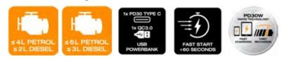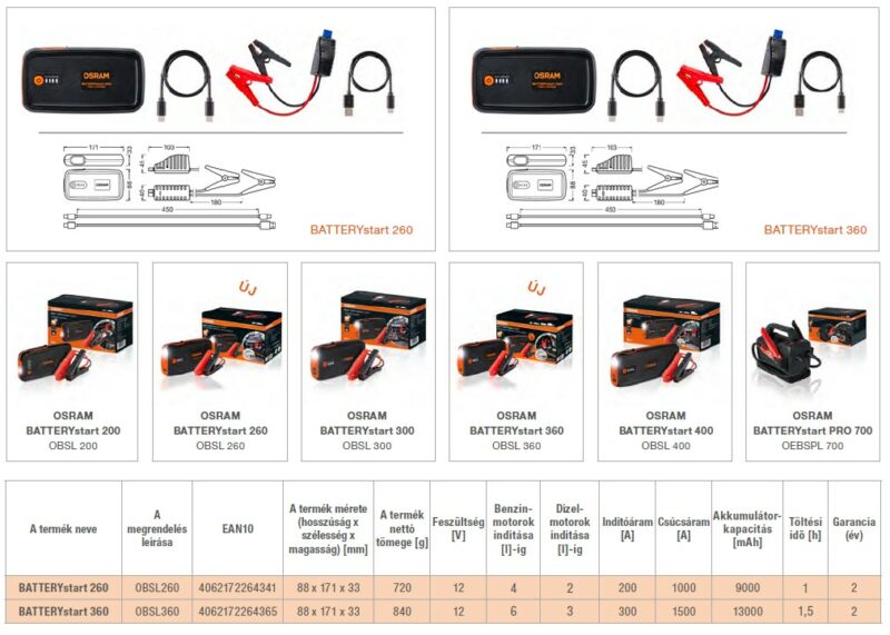 A BATTERYstart 260 készüléket 12 V-os elektromos járművek és legfeljebb 4 literes benzines, illetve 2 literes dízel motorokkal ellátott gépjárművek gyorsindítására terveztük nagy teljesítményű, 9 000 mAh lítium akkumulátorral. A BATTERYstart 360 készüléket 12 V-os elektromos járművek és legfeljebb 6 literes benzines, illetve 3 literes dízel motorokkal ellátott gépjárművek gyorsindítására terveztük nagy teljesítményű, 13 000 mAh lítium akkumulátorral. A készülékek emellett biztonsági kapcsokkal, megfordított polaritás, rövidzárlat és túlfeszültség elleni védelemmel rendelkeznek. A mindössze 720 g és 840 g súlyú készülékek könnyen kezelhetőek és üzemeltethetőek.