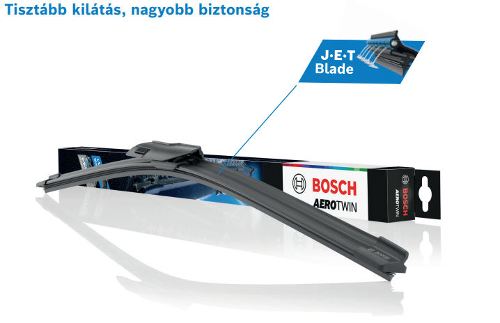 Ha az első szélvédő tisztítására a mosófolyadékot hagyományos fúvókákból permetezik, a folyadék egy része gyakran permetködként elpazarlódik. Ezen felül a pára a vezető látóterét is akadályozza. Az új Bosch Aerotwin J.E.T Blade ablaktörlők a Jet Evolution technológiával (J.E.T) közvetlenül az ablaktörlő elé osztják el a mosófolyadékot. Ennek az az oka, hogy a permetező fúvókák be vannak építve a pengébe. Az eredmény egy hatékonyabb tisztítás zavaró permetköd nélkül, ezáltal jobb látás és nagyobb biztonság.