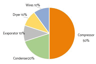 (kompresszor 50%, kondenzátor 20%, elpárologtató 10%, szárító 10%, vezetékek 10%)