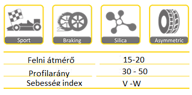 Aszimmetrikus futófelület-kialakítás nagy mintázati blokkokkal és speciális keverékkel kiváló tapadási képességet biztosít