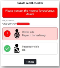 A kijelzésen az látható, hogy az adott gépkocsi esetén a vezetőoldali (Driver side) kormány légzsák érintett a visszahívásban és azt ki kell cserélni, míg az utasoldali légzsák (Passenger side) cseréje már megtörtént.