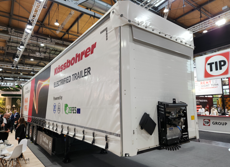 Azzal kezdem, hogy elmagyarázom, hogy az elektromos pótkocsik tesztelése folyamatosan zajlik, normál használat mellett történik. Kässbohrer a ZF-fel közösen szervezett két projektet mutatott be: egy elektromos ponyvás pótkocsival végzett kísérletet a Scaniánál, a svédországi és hollandiai gyártóüzemek közötti közúti kompvonalon, valamint a Volvo Trucks és a DPD elektromos konténerpótkocsival végzett tesztjeit 25 méteres szerelvénnyel az Eindhoven és München közötti útvonalon.